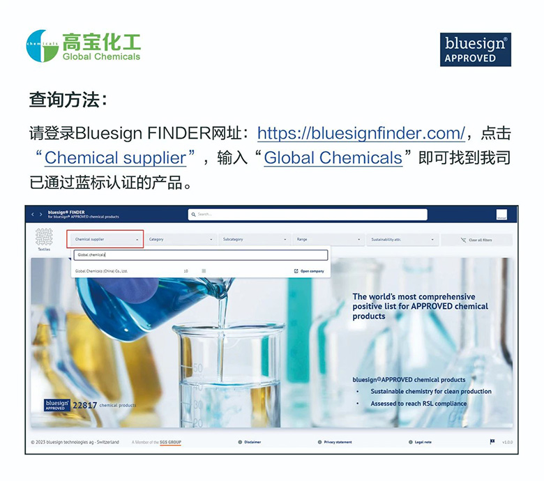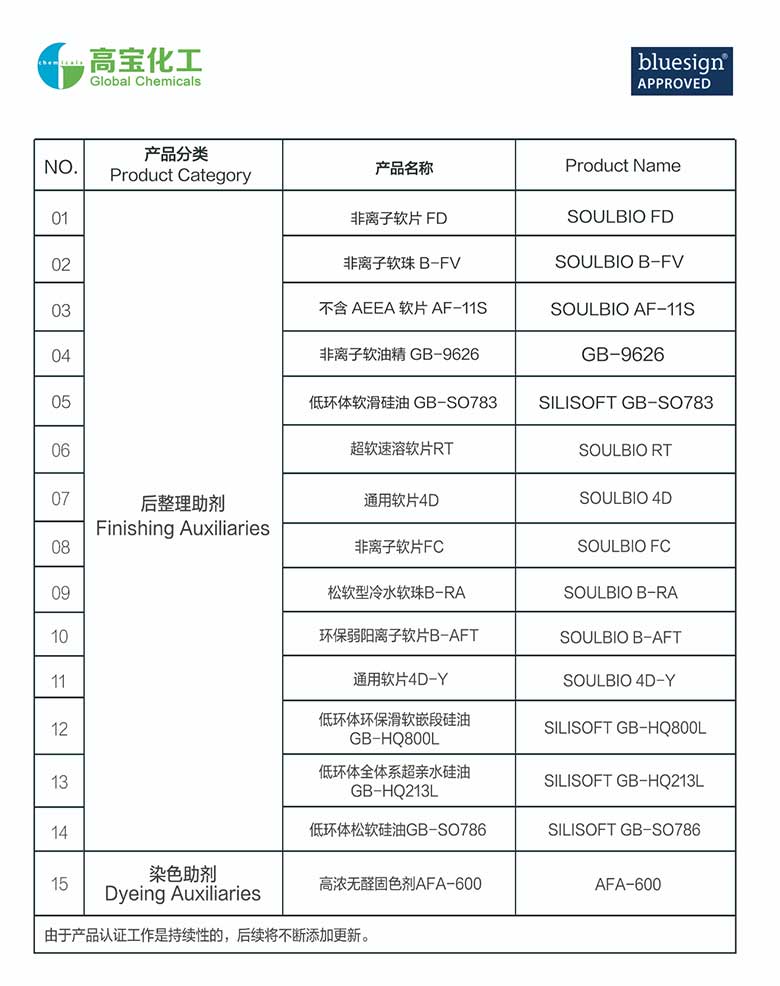 Recently, the cost-effective softener flake, 4D-Y from Global Chemicals has obtained Bluesign® Certification.